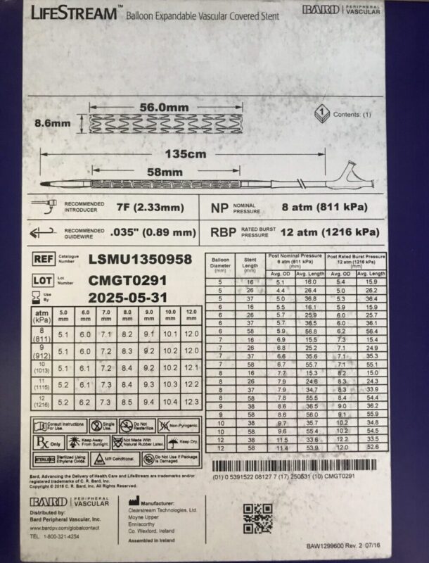 BARD LSMU1350958 LifeStream Balloon Expandable Vascular Covered Stent 9mm x 58mm x 135cm (X)
