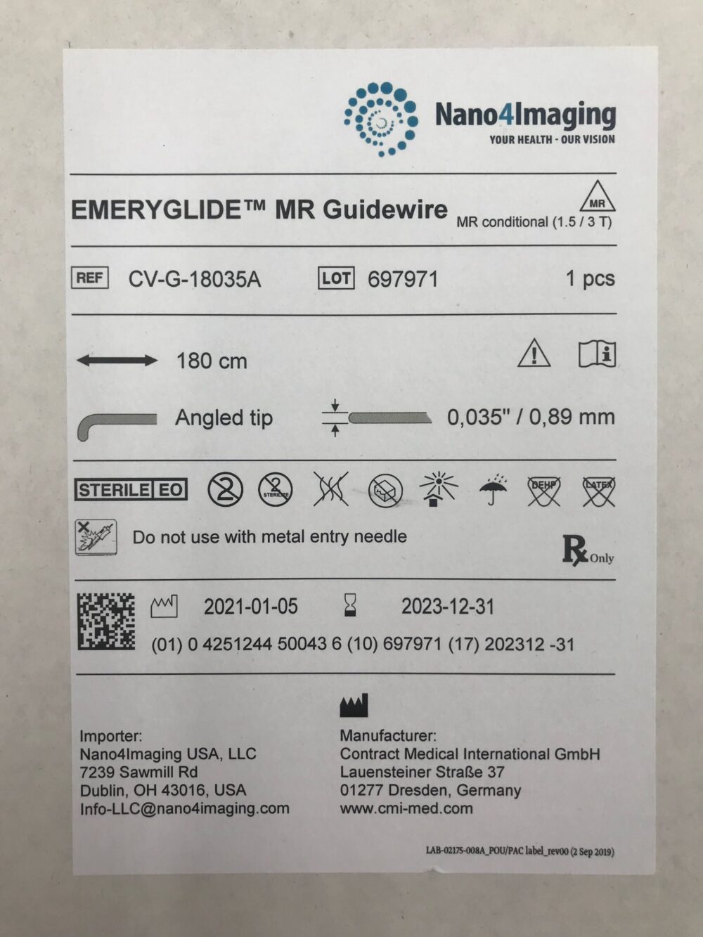 CONTRACT MEDICAL CV-G-18035A Nano4Imaging Emeryglide MR Glide, Angled Tip 180cm (X)
