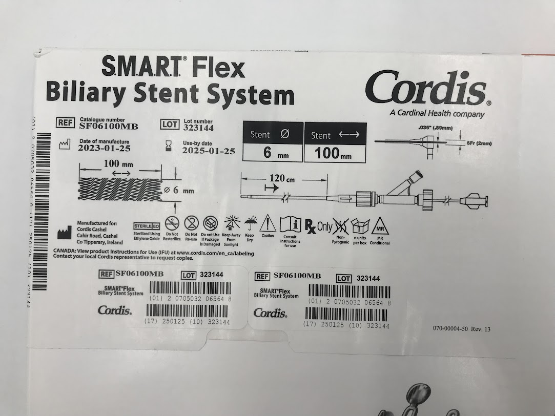 CORDIS SF06100MB SMART Flex Biliary Stent System 6FR, 6mm x 100mm x 120cm (X)