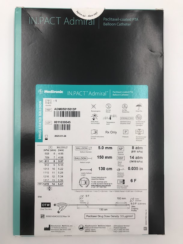 MEDTRONIC ADM05015013P IN.PACT Admiral Paclitaxel-Coated PTA Balloon Catheter 6F x 150cm, Balloon Diam. 5.0mm x 150mm (X)