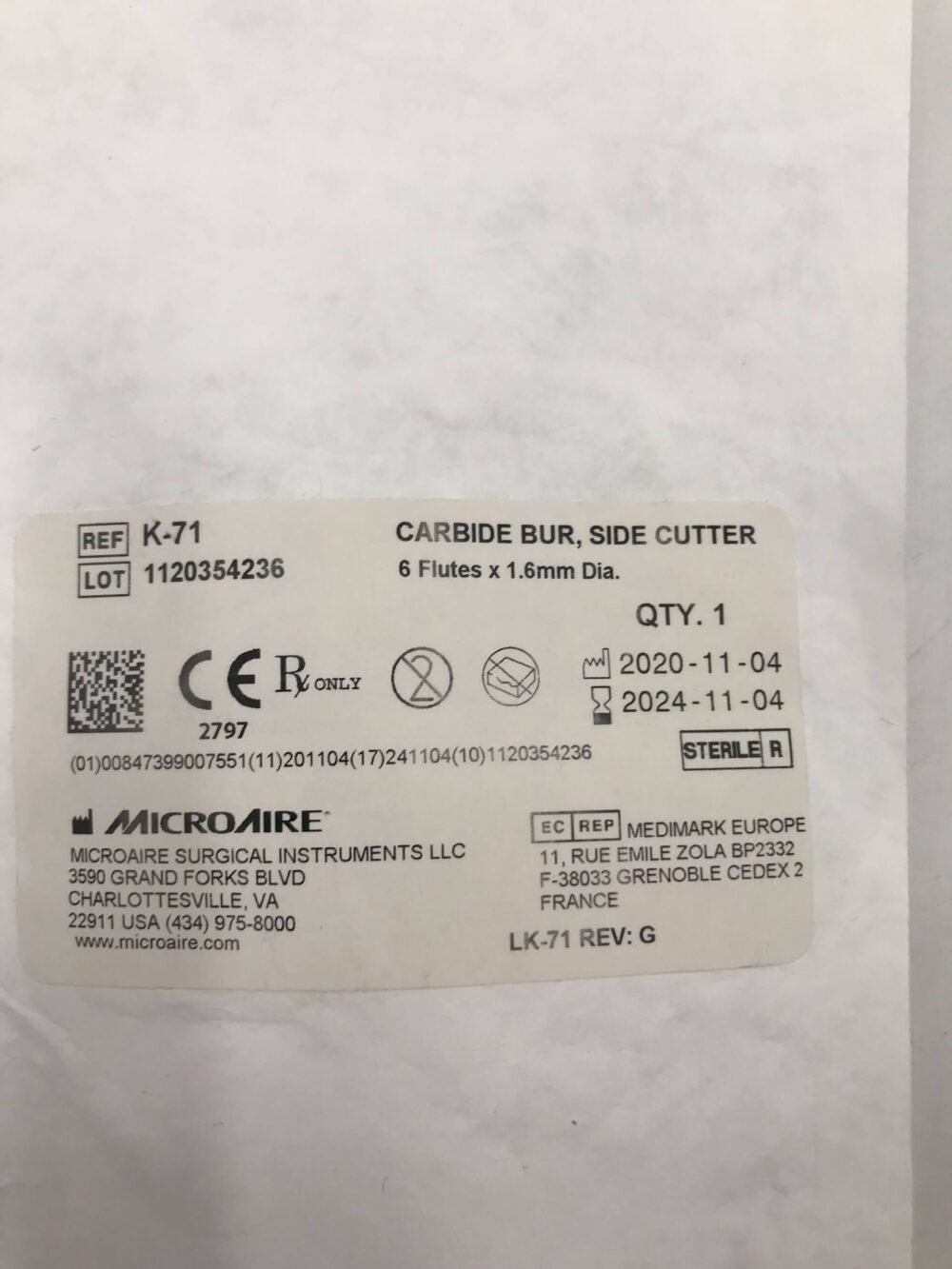 MicroAire K-71 Carbide Bur Side Cutter 6 Flutes x 1.6mm Dia. **Expires 2024-11-04**