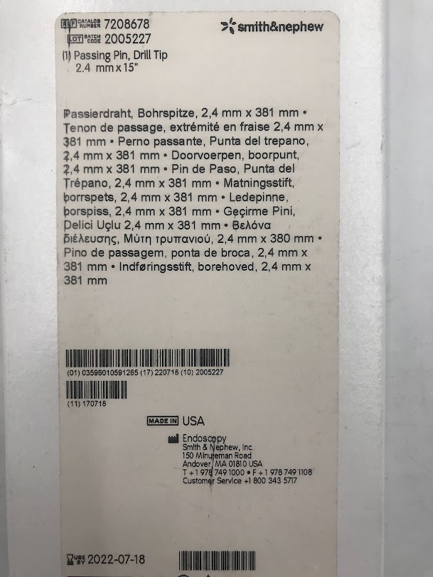 SMITH & NEPHEW 7208678 Passing Pin Drill Tip 2.4mm x 15″ (X)