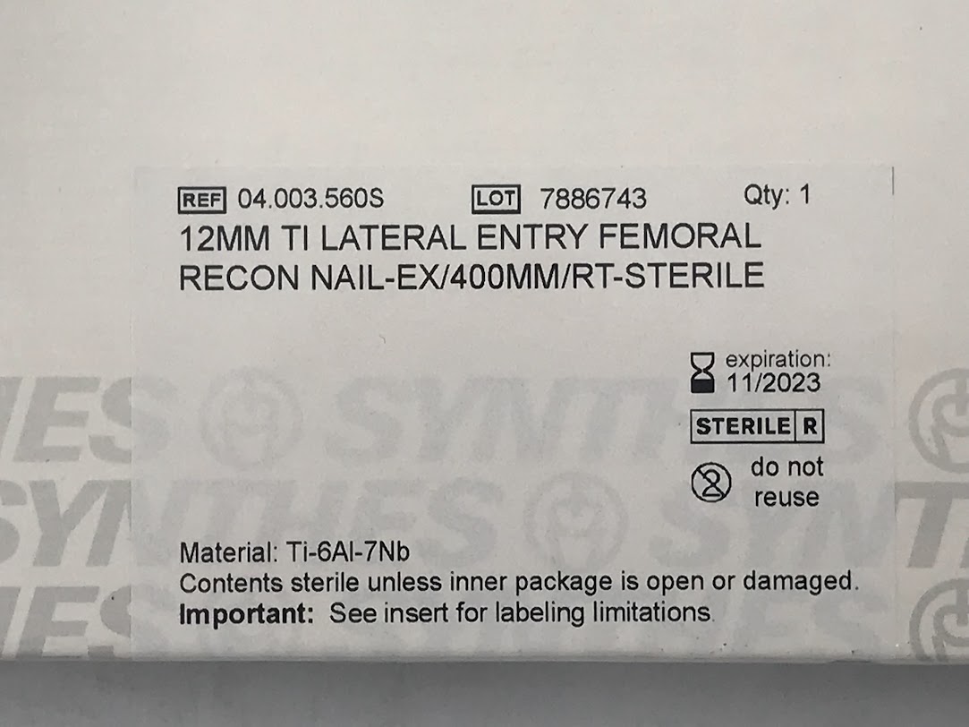 SYNTHES 04.003.560S TI Lateral Entry Femoral Recon Nail-Ex RT 12mm x 400mm (X)